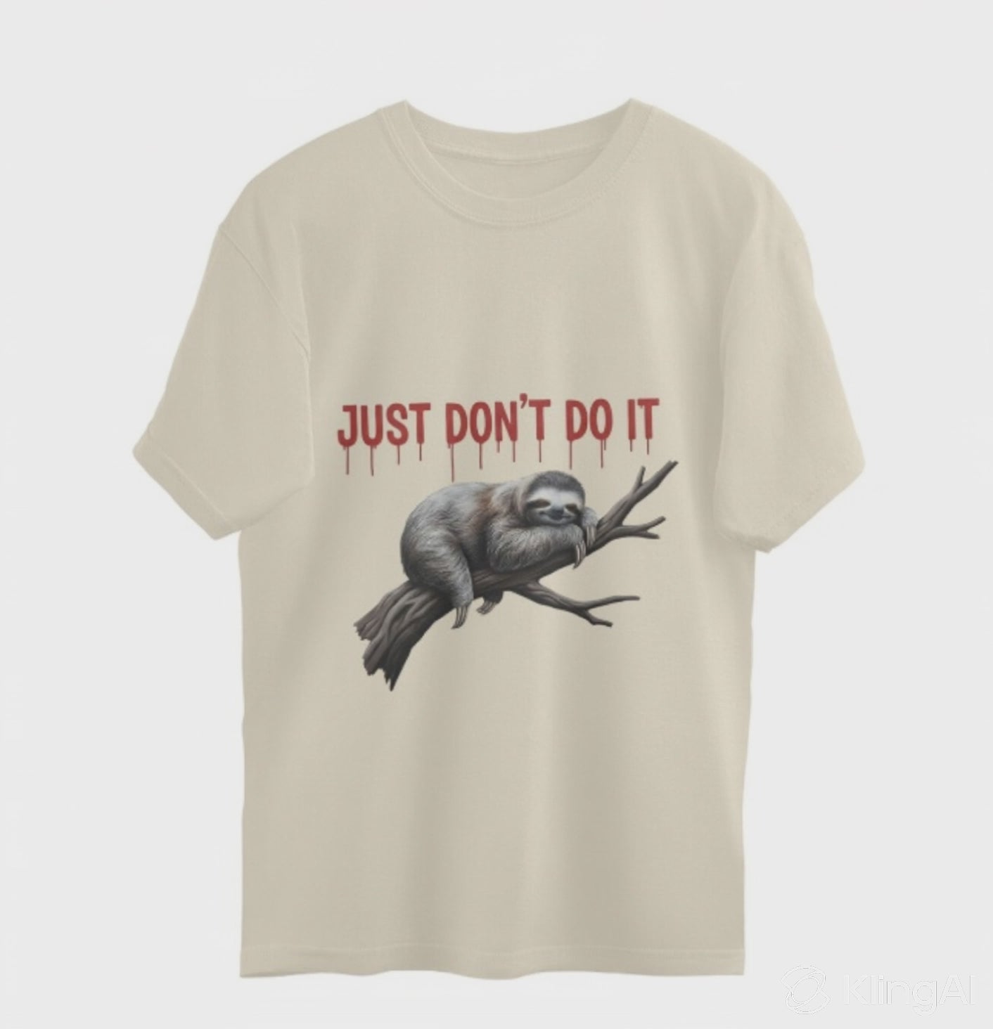 Soft white/off-white premium cotton with an irresistibly cute sloth graphic and the iconic "Just Don't Do It" tagline. Because sometimes the best plan is no plan at all.