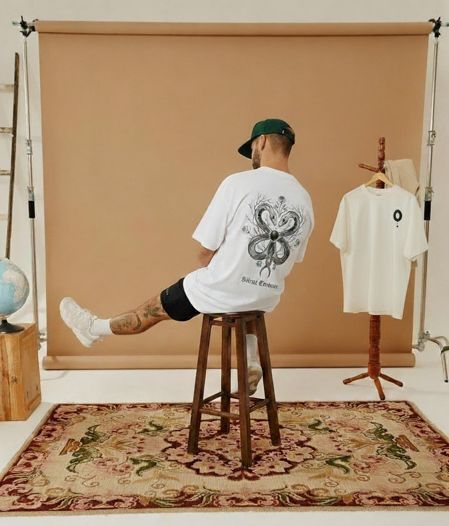 Step into contemporary streetwear with the Silent Embrace oversized t-shirt, designed for those who appreciate both comfort and bold artistry. Featuring a minimal chest print on the front and a striking symbolic snake-and-nature inspired illustration on the back, this tee merges mystique with modern fashion.