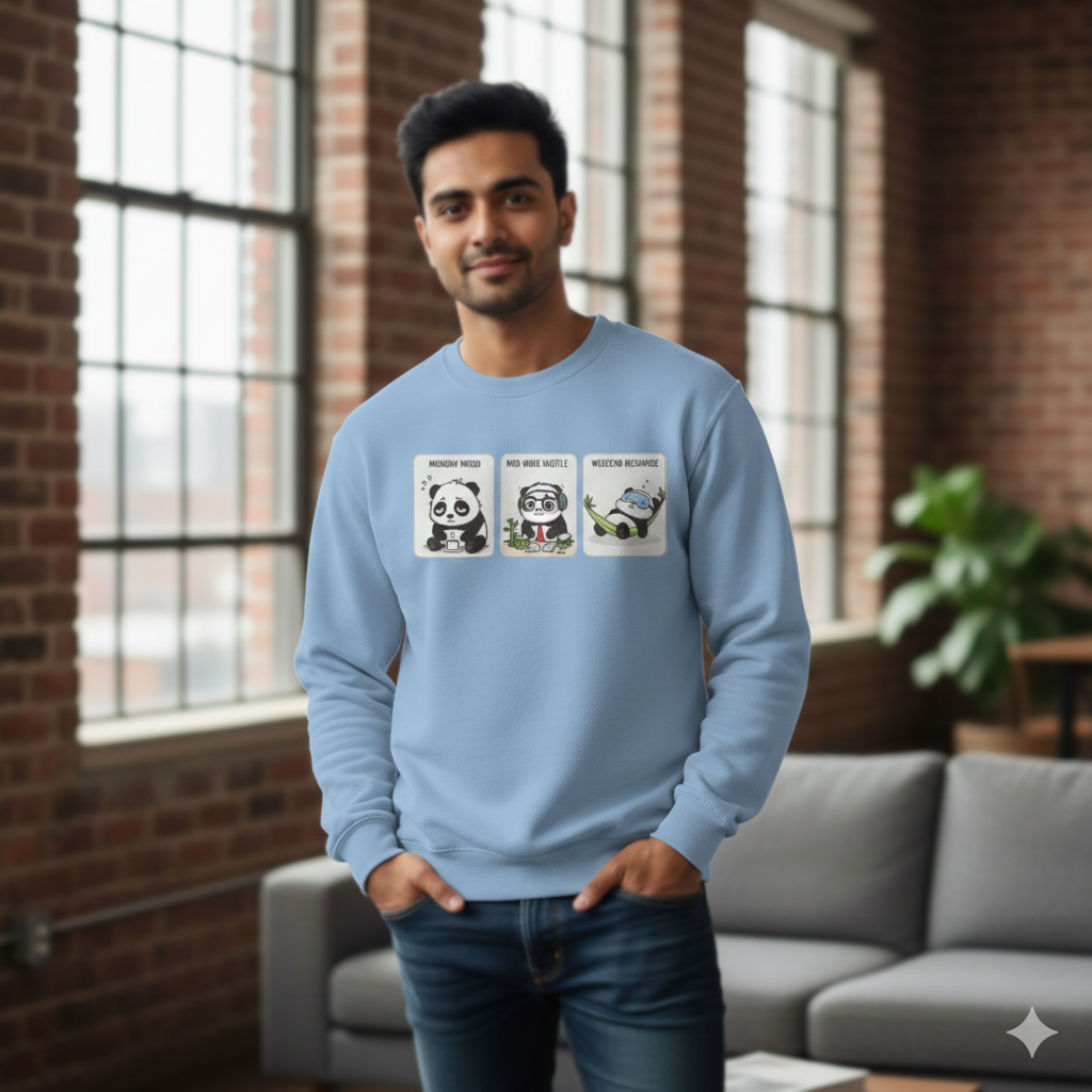 This men’s panda sweatshirt is all about Monday blues → Mid-week hustle → Weekend energy. Cute, comfy, and totally vibe-worthy—perfect for guys who love fun graphics, easy style, and effortless comfort.