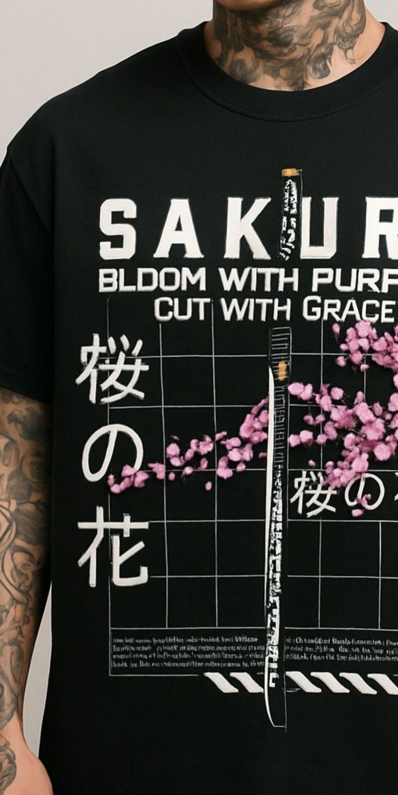 Channel the spirit of the samurai with our Sakura Katana Bloom Graphic Tee, designed for fans of anime, Japanese culture, and street fashion. The bold print features a katana slicing through a digital grid, releasing soft sakura (cherry blossom) petals—symbolizing elegance, transience, and power. Finished with striking kanji (桜の花) and impactful typography, this piece blends anime-inspired art with modern streetwear vibes.