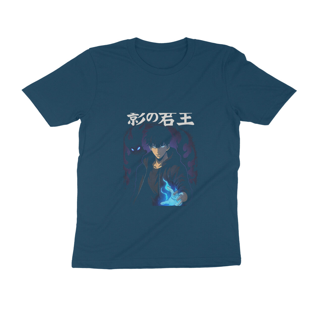 Step into the shadows with Jin-Woo, the ultimate hunter turned Monarch. This tee glows with dark energy, featuring Japanese kanji for “Shadow Monarch” above a striking blue aura design. Perfect for Solo Leveling fans who want to carry the power of the dungeons wherever they go..
