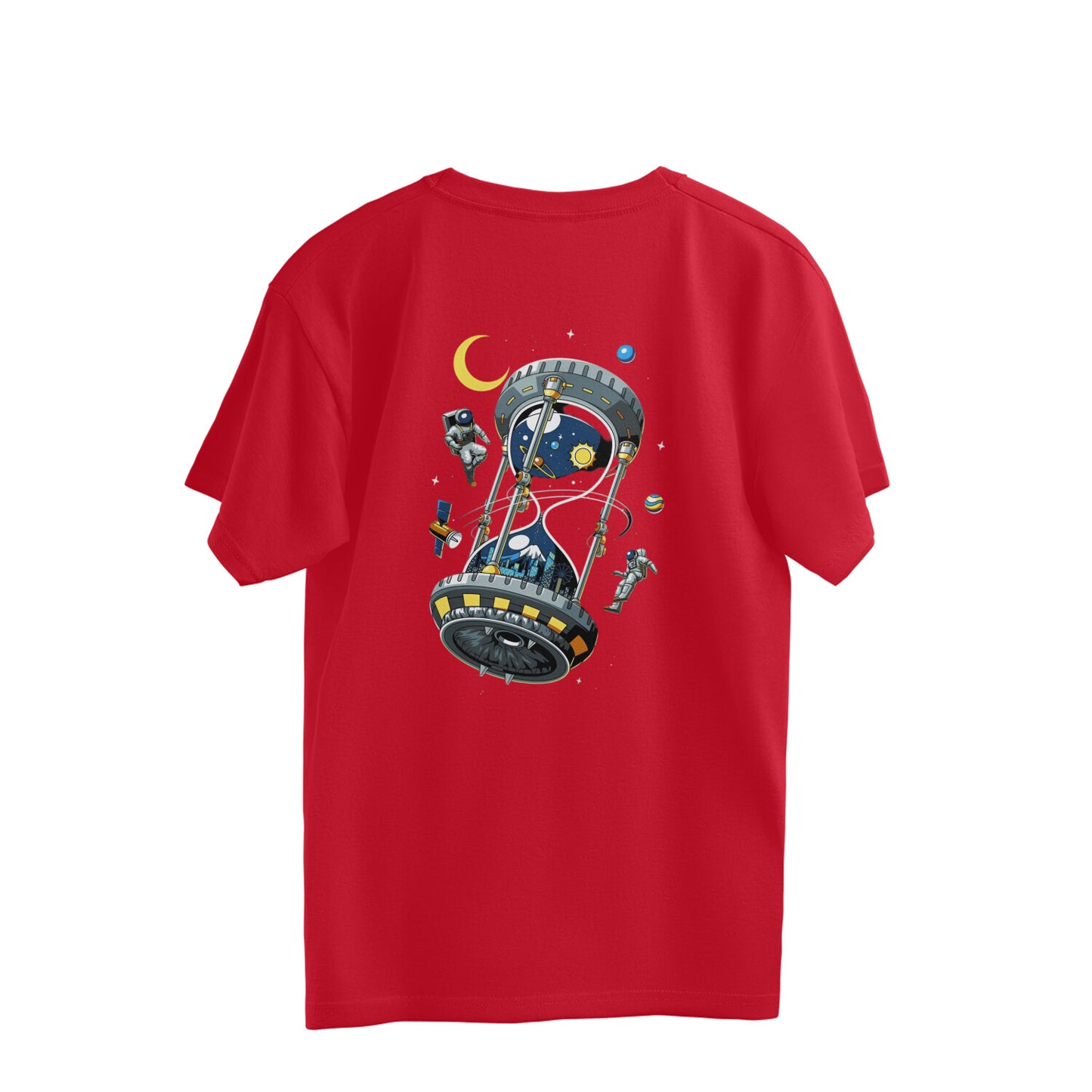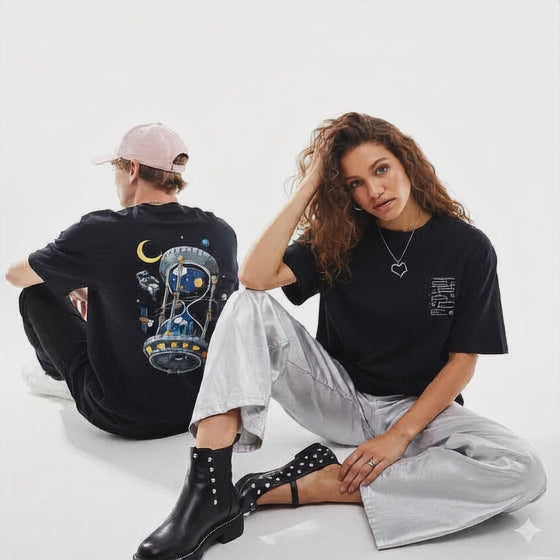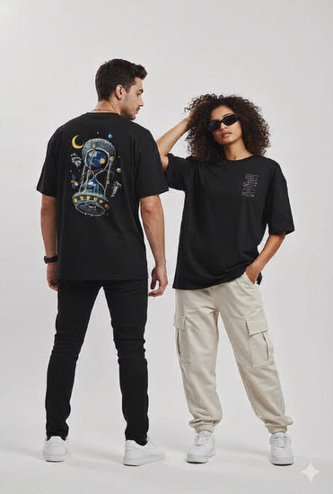 This Oversized T-Shirt is the perfect blend of style and comfort. Featuring a minimal graphic on the front and a bold space-themed hourglass print on the back, it adds a trendy edge to your look. Made from premium cotton fabric, it’s an ideal choice for any casual outfit